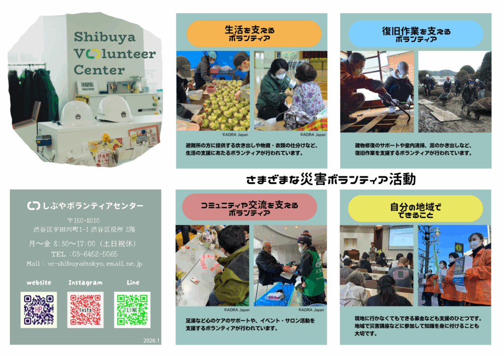 この「渋谷区災害ボランティアセンター」では、運営協力や被災地支援スタッフとして活動する「災害ボランティア」を募集しています。