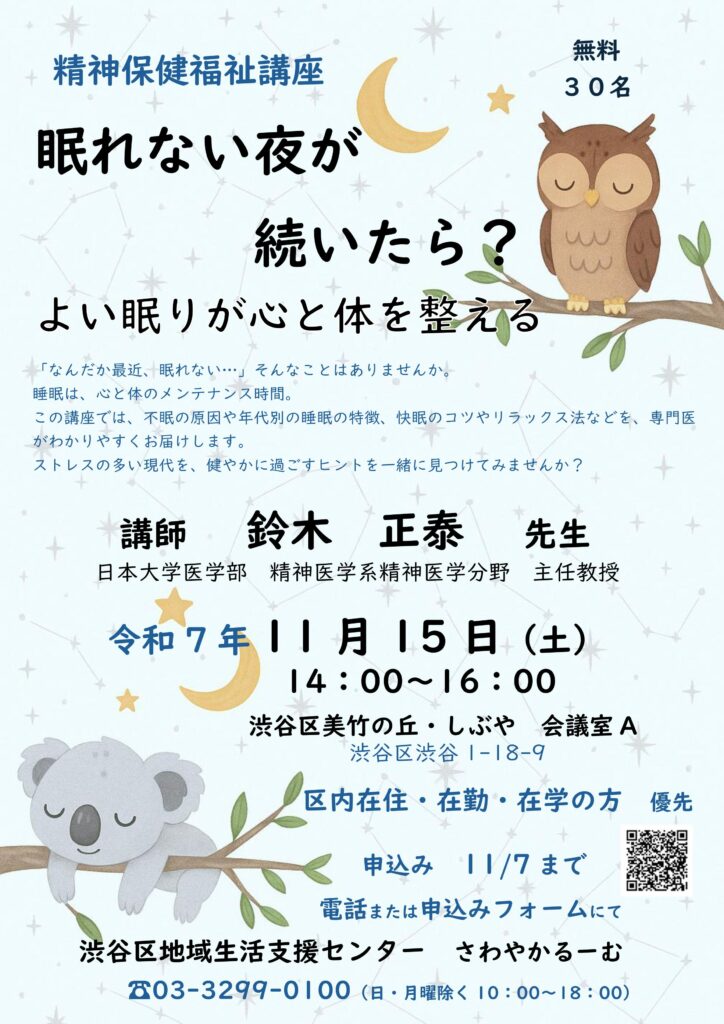 渋谷区地域生活支援センター「さわやかるーむ」では、精神保健福祉への理解を深めるため、睡眠をテーマにした講座を開催します。