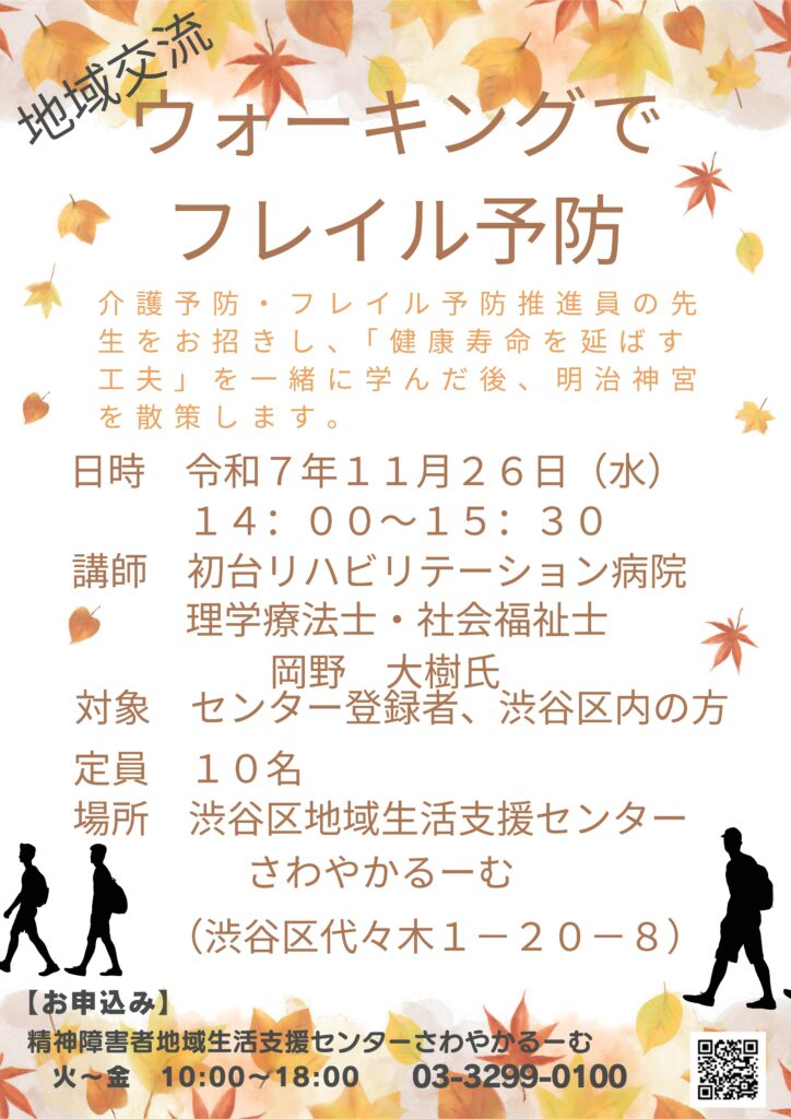 介護予防・フレイル予防推進員の先生をお招きし、 「健康寿命を延ばす工夫」を学んだ後、明治神宮を散策します!