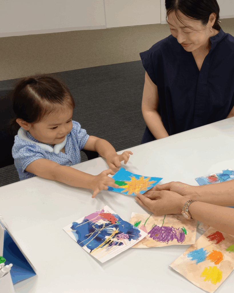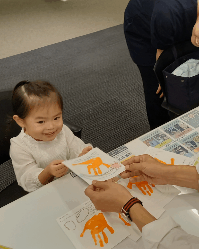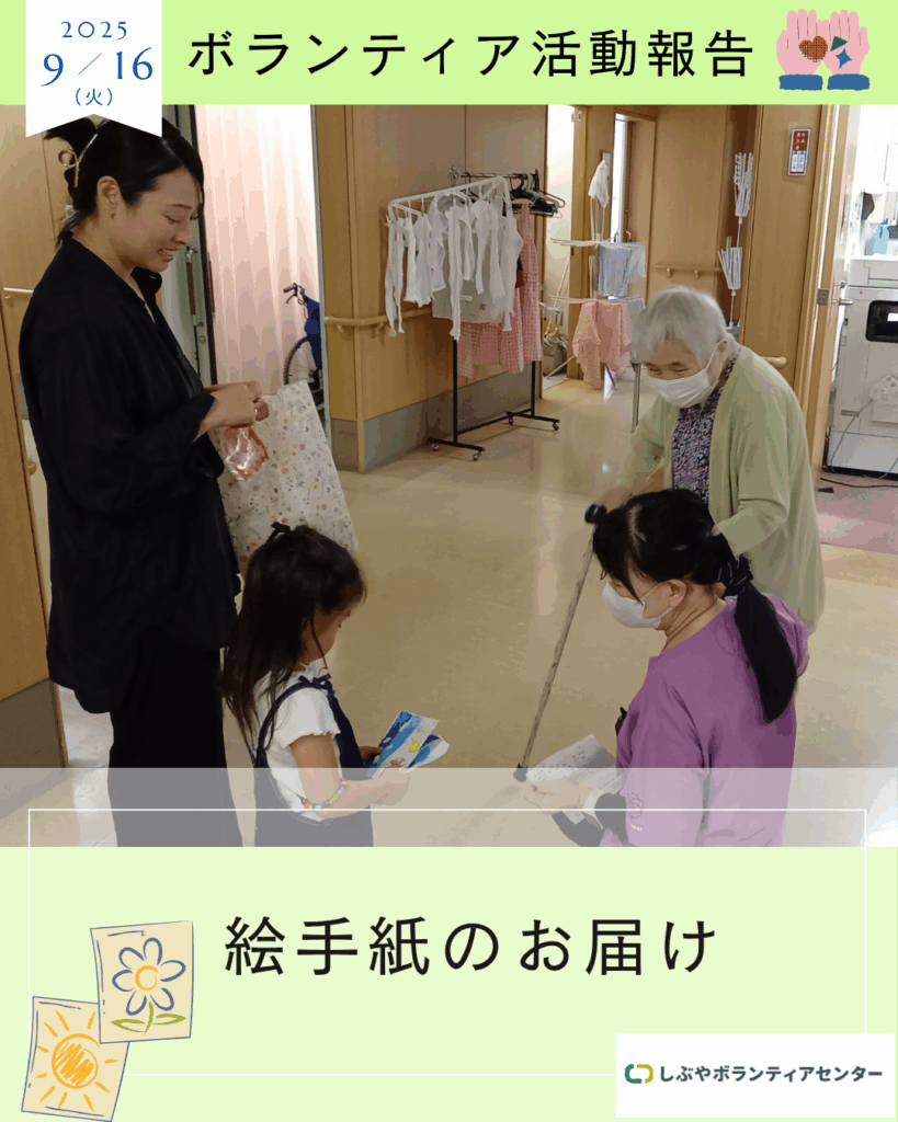 今回は、完成した絵手紙を高齢者施設に直接届けに行きました。少し緊張気味なAちゃんに周りのみんなが笑顔になる一時でした。